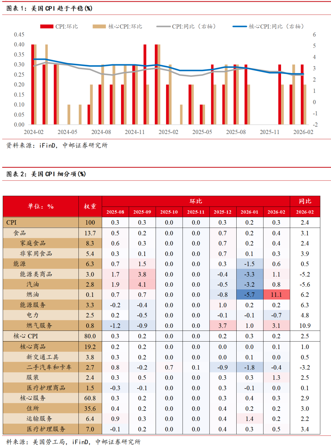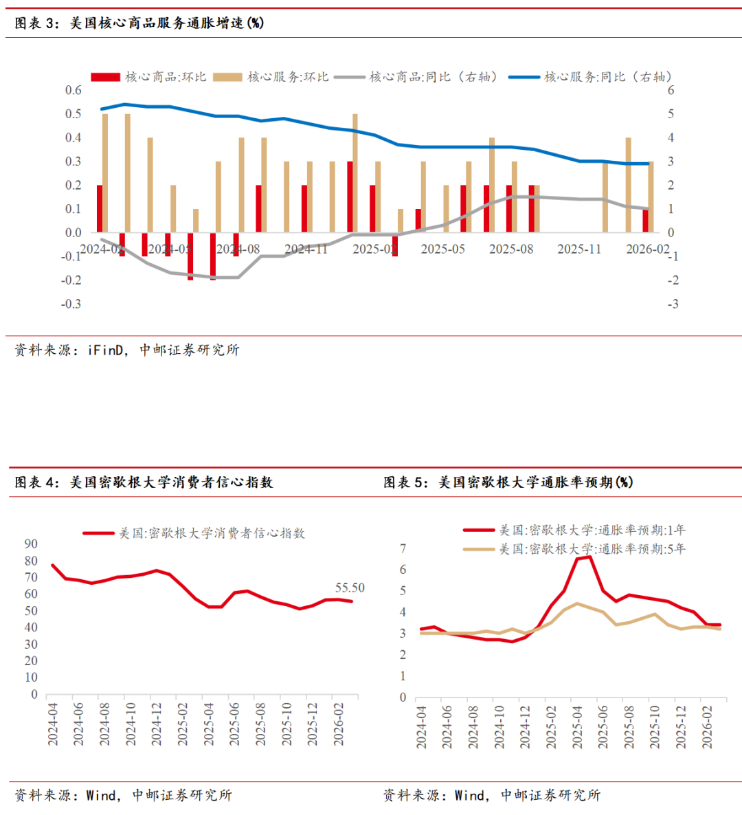 经济数据方面,上周美国公布2月份CPI数据,整体显示通胀延续温和降温的趋势。美国2月CPI同比上涨2.4%,季调后环比上涨0.3%。剔除食品和能源后的核心CPI同比上涨2.5%,环比上涨0.2%,各项核心指标均符合市场预期。从细分结构来看,核心商品通胀压力较小,2月同比仅上涨1.0%,此前市场对于关税可能推升商品价格的担忧有所缓解;核心服务2月同比录得2.9%,环比上涨0.3%。然而,2月通胀数据尚未计入中东冲突后油价上涨的影响,预计在后续几个月的数据中,油价将对整体CPI有所推升,对美联储更关心的核心CPI影响则相对较小。